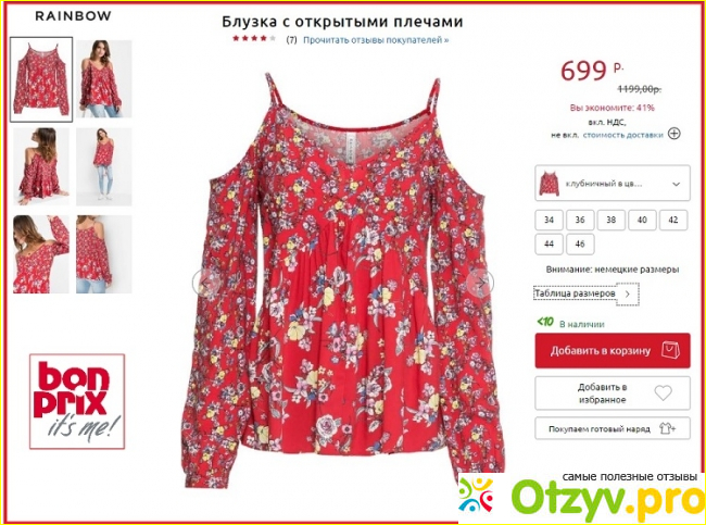 Приобретение одежды и обуви в Интернет-магазине – это особый вид шопинга. Онлайн нельзя не только примерить вещь, но и даже пощупать ее, чтобы понять, насколько она качественна, эргономична и подходит ли она по размеру. Нужно точно знать свои актуальные размеры и обладать высокой интуицией, дабы не прогадать с покупкой. Большую помощь оказывают отзывы покупателей, в них могут описываться такие нюансы, о которых не упоминал продавец, в данном случае – Bonprix, но они являются весьма существенными для потребителя. Я рекомендую обязательно читать такие отзывы и самим писать их, чтобы помочь другим.
