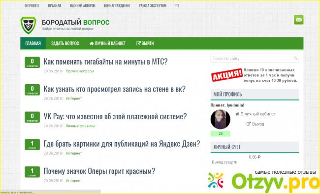 На Бородатом вопросе (промокод при регистрации TBAKPQ) зарегистрировалась две недели назад, в прошлое воскресенье уже набрала минималку - 150 рублей, во вторник (15.08.2018) мне ее выплатили на кошелек Вебмани. Сегодня набираю вторую минималку для вывода (нужно оформить заказ на выплату до воскресенья включительно, чтобы выплатили деньги в понедельник или во вторник). На самом деле можно зарабатывать гораздо больше, я не очень много времени уделяю сайту, можно получать и 420 рублей в день.