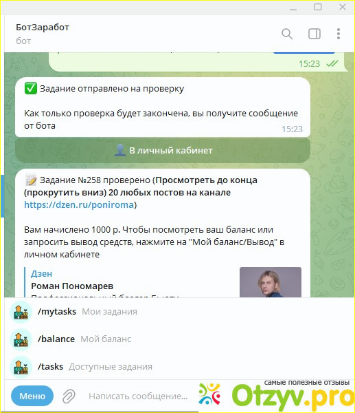 Задания интересные в ботЗаработ, но бесплатные. Создатель навариться на ваших бесплатных действиях по лайкам и подпискам, и к тому же еще получит ваши 2000. Обходите его стороной, скоро этот бот исчезнет и на его месте появится другой с такими же жирными предложениями.