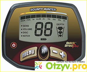 Панель вполне удобная и не вызывает каких либо трудностей. Тем кто уже сталкивался с металлодетекторами ранее, смогут разобраться самостоятельно и с металлодетектором Bounty hunter quick draw pro. Кнопка влючения находится с лева от дисплея. По самому центру располагается кнопка определения центра поиска цели, что очень даже удобно в современных металлодетекторах. Ну и разумеется под правую руку с правой стороны от дисплея располагаются клавици плюс и минус, для регулирования параметром металлоискателя Bounty hunter quick draw pro. Кстати максимальное значение на этом устройстве устанавливается по десятибальной системе, естественно если вам нужна максимальная чувствительность устройства, то и выставлять необходимо параметр чувствительности на десятку. Но как правило зачастую для поиска металлов вполне достаточно диапазона среднего, где-то от четырех до восьми, но как правило новички и вообще многие любители подобных занятий выставляют сразу всё на максимум и на максимум поиск металлов, и в итоге вкапывают всевозможные ржавые банки и прочий хлам. Но здесь о вкусах не спорят и у каждого свои методы поиска необходимых металлических кладов, и в челом лучше выставлять определенные параметры, чем искать всё подряд. В общем здесь уже каждый сам себе выберет то что ему действительно необходимо в плане поиска всевозможных кладов. С лева менюшка для открытия функций металлодетектора. В общем никаких трудностей с настройке и регулировании возникнуть не должно, к тому же можно достать инструкцию и детально изучить что и как настраивается, либо найти в интернете нужную для настройки металодетектора информацию.