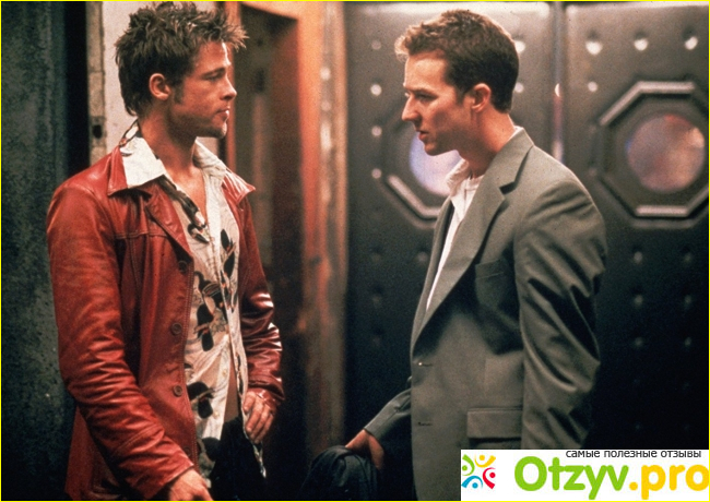 Финчер перенес данную проблему на экран с помощью известных, но при этом очень подходящих на роль актеров. Портреты героев выглядят великолепно, но главная заслуга создателей — это образы отрешенного города, ненавистной работы, давящего безделья и ужасной скуки. Нам хотят сказать, что в нынешнее время сильному полу совсем нечем заняться. Когда-то они являлись охотниками и добытчиками пищи для своей семьи. Они валили мамонтов и защищали очаг от других диких зверей. Сейчас же мужчины стали офисными крысами; инстинкты, когда-то часто использовавшиеся, теперь не нужны современному обществу. Сегодняшние условия жизни не требуют особых физических данных, никто не охотится ради выживания и не живет в диких условиях. Социум в корни изменился. Но инстинкты остались. Именно поэтому мужчины с радостью влились в общество бойцовского клуба. Это их своеобразная отдушина от мирской суеты и непонимания смысла их существования. Отсюда вытекает и знаменитая философия Тайлера Дердена (Брэд Питт), которая давно стала культовой не только на Западе, но даже и у нас, в России. Особенно она интересна более молодому поколению, которое старается во многом подражать их кумиру в отличном исполнении Питта.