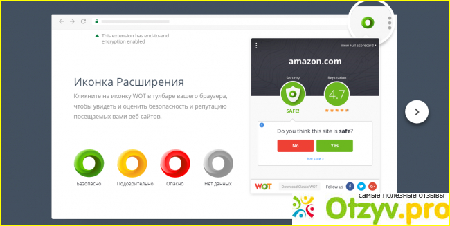 Когда Вы скачаете и установите это расширение, в правом верхнем углу браузера появится "баранка", изменяющая свой цвет в зависимости от безопасности открытого сайта, своеобразный светофор. Красный цвет обозначает опасность, жёлтый предупреждает, что количество положительных и отрицательных отзывов для сайта равно, зелёный - наличие только положительных отзывов. При попытке зайти на такой сайт появляется предупреждение.