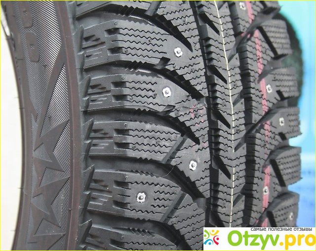 Шипы в резине очень хорошо сидят. Распаложены они все специально, чтобы во время движения или совершения маневра были задействованны. Они очень плотно и по особой технологии посажены в этой резине. Посадочное место так же усиленно. Что исключает потерю шипов. Поэтому эта автомобильная резина является устойчива к износу. А это большое преимущество между другими зимними резинами. К тому же еще не мало важен расположение протектора. По центру шины проходить полоска. Которая придает устойчивость. К тому же расположены ламели в виде елочки. Которые не позволяют забуксовать в рыхлом снеге или в снежной каше. Рисунок в виде елочки находится не только по середине шины, но и по бокам. Они так же задействованы, позволяют хорошо входить в повороты и совершать маневры без риска заноса.