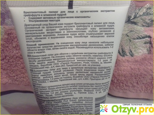 Доброго времени суток всем заглянувшим в мой отзыв! Я люблю посещать магазины сети "Органик шоп", которых в городе Москве несколько. Как-то раз увидела в этом магазине вот этот бриллиантовый пилинг для лица с органическим экстрактом грейпфрута и алмазной пудрой от бренда Organic Therapy, который выпускает ООО "Первое решение". Решила я его попробовать.