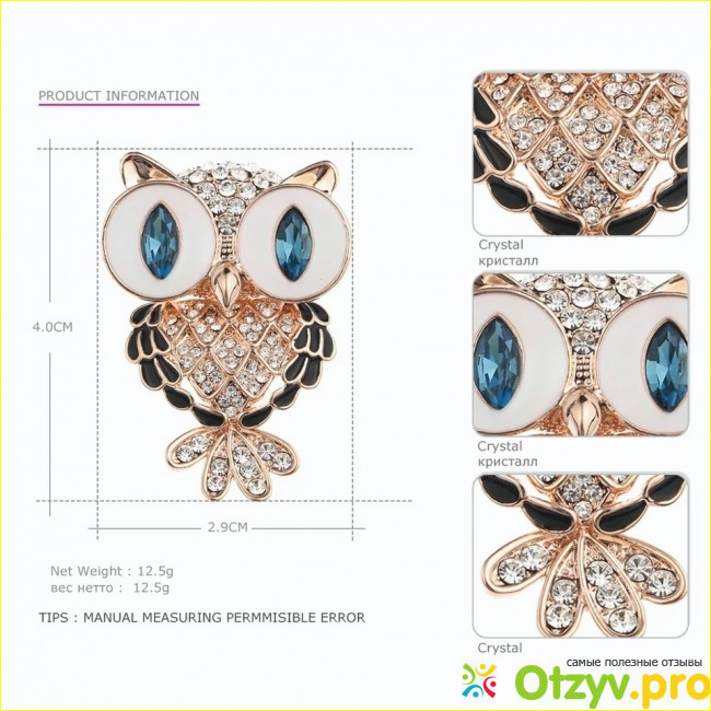 Брошка такая замечательная, что сам продавец не мог расстаться с ней 8 дней и не оформлял заказ. Шучу, конечно! Летела совушка ко мне через Латвию, поэтому была в пути больше месяца. Упаковка- слой пупырки и пупырчатый пакет. В качестве подарка я обнаружила серьги-гвоздики! Брошечка была приколота на фирменную картонку и упакована в пакетик, всё как положено! В таком оформлении не стыдно и в подарок эту совушку преподнести. Размеры брошки-2,9см*4,0см. Вес 12,5 г. Выполнена она из жёлтого металла, а именно из цинкового сплава. "Пёрышки" на крыльях и глазки покрашены эмалью. Зрачки-два больших синих кристаллика. Много-много мелких прозрачных кристалликов вставлено на голове, грудке и хвостике совы. Все кристаллики на месте, держатся прочно, красиво переливаются и поблескивают. На брошке я вообще не обнаружила никаких изъянов, даже малейших! Всё сделано качественно, ровно, симметрично. В руках даже приятно держать! Закрепляется брошка на одежде с помощью обычной булавки, которая находится на обратной стороне совиной головки. Она без застёжки с поворотным рычажком (как обычно делают на брошках), но при этом не выглядит ненадёжной, застёгивается хорошо, не хлипко. Попыток расстегнуться и потеряться за брошкой замечено не было! А теперь самая главная изюминка этой брошки- голова и хвост совы соединены с туловищем подвижно!!! Поэтому при ходьбе совушка покачивает телом и хвостиком, как будто шевелится! Огромное спасибо магазину Mloveacc Official Store за пополнение моей совиной коллекции таким замечательным экземпляром (теперь одним из самых моих любимых)! Теперь буду заказывать разные брошки только здесь. Благо найти в ассортименте этого магазина можно брошки в виде чего только угодно: от ящерки до слона, с радужным жирафом и от морковки до самолёта с роялем! В общем советую вам тоже заглянуть в этот магазин и приглядеться на замечательные брошки, не пожалеете! И обязательно найдёте что-нибудь для себя! А моя брошка-совушка теперь живёт на моём рабочем жакете и каждый день радует меня и заряжает позитивом! На этом всё, спасибо за внимание!