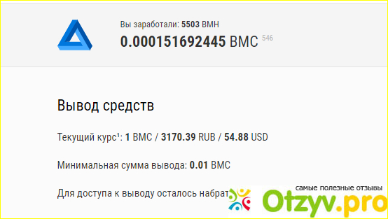 Ну для более мощных компьютеров, понадобится около года, при соблюдении выше перечисленных условий. А чего стоит только сумма на выплату, посудите сами, цена одной монеты данного ресурса 1BMC=3132.52 рубля, а минимальная сумма на вывод-0.01BMC, следовательно вы получите 31.32 рубля плюс минус, в зависимости от курса биткоина и комиссии платёжной системы, через которую будете осуществлять вывод ваших средств. Вот и посудите сами, нужно ли вам в пустую тратить ресурсы вашего компьютера.