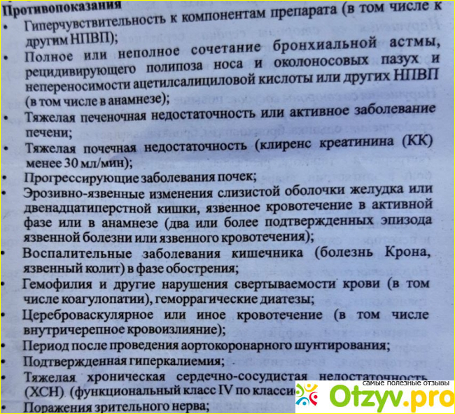 Противопоказанием для его приёма может являться язвенное заболевание желудка и двенадцатиперстной кишки в острой форме, желудочно-кишечное кровотечение, заболевания почек, бронхиальная астма, непереносимость препаратов на основе НПВС, поражения зрительного нерва, заболевания печени, воспалительные процессы в кишечнике, возраст до 2 лет, беременность и период кормления грудью, и т. д.