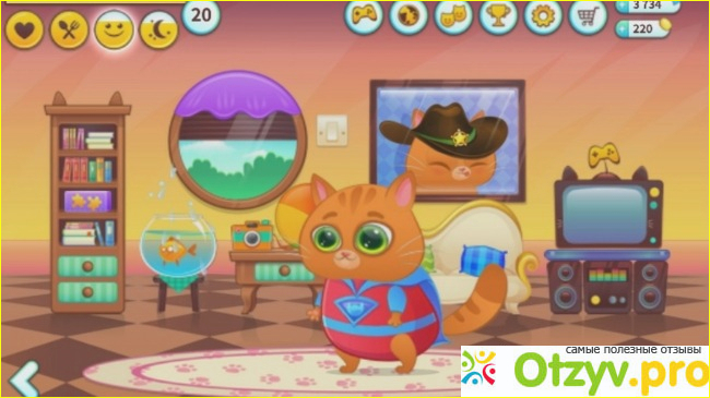 Кроме того, за любое действие у Бубу немного прокачивается уровень. Новые уровни открывают новые миниигры, комплекты одежды, цвет шерстки, еду и декор интерьеров. Можно, конечно, не ждать, а купить за кристалики. Но в игре они выбиваются нечасто, а тратить на это реальные деньги лично меня жаба давит.