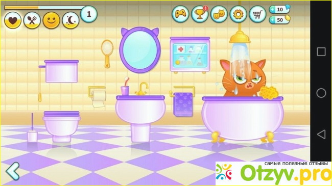 Сюда Бубу идет, когда грязный, или хочет на горшок. Учтите, когда кисик требует туалета, с ним мало что еще можно сделать (и я его понимаю). В шкафчике-аптечке можно приобрести зелья для быстрого восстановления энергии, утоления голода и т. д. Опять же за монетки.