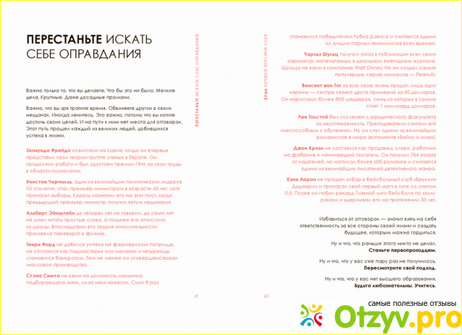 Так уж вышло, что я человек который никогда не имел больших амбиций. Довольствоваться малым принято в моей семье. И именно это мне захотелось изменить. Сейчас я ставлю цели в несколько раз превышающие то, на что я могла бы рассчитывать раньше. Это расширяет восприятие, учит нейроны мозга работать иначе и вообще строить стратегию поведения по-новому. Книга стоящая, хотя нельзя сказать, что она уникальна и в ней найдутся ответы на все жизненные вопросы. Рекомендую, если вам хочется ценного пинка для активных действий.