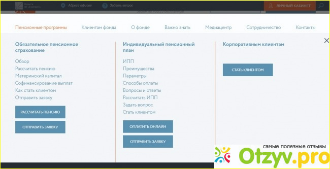 Индивидуальный пенсионный план. Здесь вы узнаете о преимуществах ИПП, условиях (первоначальный взнос, периодичность и продолжительность взносов, периодичность и продолжительность выплат, условия расторжения, срок действия договора). Существует несколько способов оплаты: через бухгалтерию работодателя, отделение Сбербанка, используемый онлайн-банк и прямо через сайт. Здесь же можно рассчитать свою пенсию по этому пенсионному плану и сделать заявку онлайн.