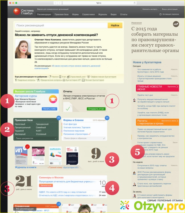 На первой странице сразу раздел “Рекомендации”. Можно увидеть “главное за сегодня”, например, актуальные новости, статьи, обновления в справочниках.