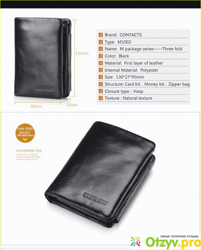 Походы по магазинам меня честно говоря ошарашили. Кожаные бумажники стоят от 2500 рублей. По моим меркам это дорого. Поэтому решил обратиться к помощи интернета. Ведущая торговая площадка сейчас пожалуй Aliexpress , да и с Webmani они работают. Поэтому решил купить у них. Выбрал бумажник Contacts из яловой кожи. Покупка обошлась мне в 1189 рублей. Доставка бесплатно. Заказ мне отправили 19 сентября , а получил я его 27 сентября. Прямо скажу , что не ожидал такой быстрой доставки. Бумажник мне понравился, приятная фактура кожи, сначала даже показалось , что он сшит из кожзама, но характерный запах кожи рассеял все сомнения. В отделениях бумажника можно хранить купюры, документы, визитки, кредитные карты, мелочь и т. д. Бумажник удобно раскладывается. Цвет тоже понравился. ну как заказывал черный, так его и выслали. Бумажник удобно помещается в карманах брюк и пиджака. Но в бочке меда не без ложки дегтя. В новый бумажник не влезает паспорт, а мне этот документ часто бывает нужен. Вроде и посмотрел заранее размеры , но не учел ширину швов. В целом первое впечатление вполне положительное. Непонятно пока с долговечностью , но как говорится поживем- увидим.