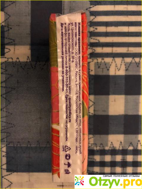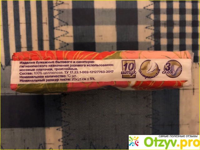 На одной боковой стороне упаковки – информация о составе изделия (стопроцентная целлюлоза), его размере и назначении: