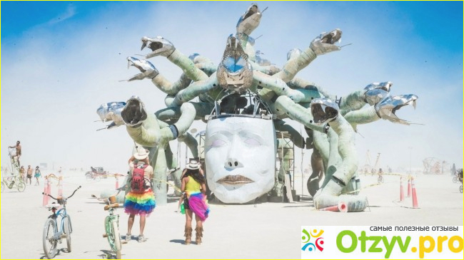 На период проведения фестиваля в пустыне устанавливаются произведения современно искусства. Чаще всего эти фигуры представляют собой нечто невообразимое и просто не поддающееся логике. Но выглядит все это очень даже симпатично, масштабно и очень современно. Некоторые фигуры сжигаются не дождавшись окончания праздника. Участники фестиваля живут в палатках, там же в пустыне. Помимо невероятных костюмов, начиная от персонажей искусства до предметов, все артефакты тоже необычные. Переоборудованные и переделанные машины гоняют по пустыне с утра до вечера. Ежедневно проходит несколько концертов, музыка не замолкает ни на минуту. На нескольких танцплощадках круглосуточно работают диджеи. Когда они умудряются отдыхать не понятно.