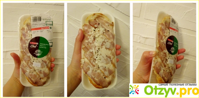 Как и прежде, изделие находилось в белой подложке из полипропилена, обернутой прозрачной пищевой плёнкой. На ней производитель разместил информационный листок и фирменную наклейку "SPAR Chef", свидетельствующую о том, что данный продукт питания произведен на собственном производстве и выпущен в продажу под этой маркой (красивом логотипом с надписью "Доверьтесь вкусу и качеству").