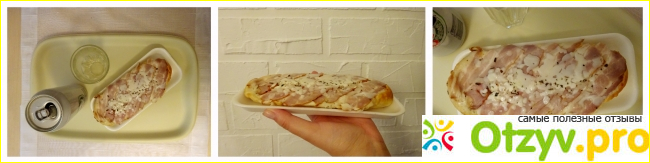 Итак, на половинку мини багета производитель разместил соус, кусочки мяса и расплавленный под воздействием высоких температур сыр, посыпанный луком. В принципе очень вкусная и сытная закуска, которая будет уместна, как к чаю, так и к пиву. Попробовать рекомендую, ибо это очень практичное приобретение, способное утолить голод за считанные минуты. Есть можно не только дома, но и в "дороге", обернув бутерброд плёнкой.