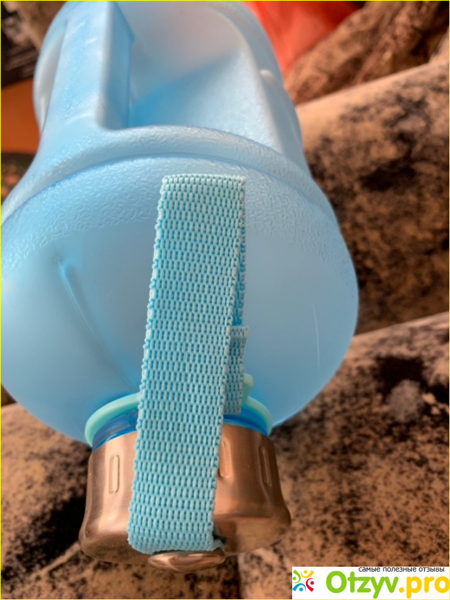 Есть металлическая крышка, которая в свою очередь снабжена дополнительным металлическим кольцом, чтоб уж точно избежать выливания жидкости. Крышка же соединяется с корпусом бутылки с помощью тканевого ремешка. Мне кажется, это очень удобно. Можно не бояться, что крышка упадет или того хуже потеряется. Лично я за этот ремешок и ношу бутылку и достаю из сумки.