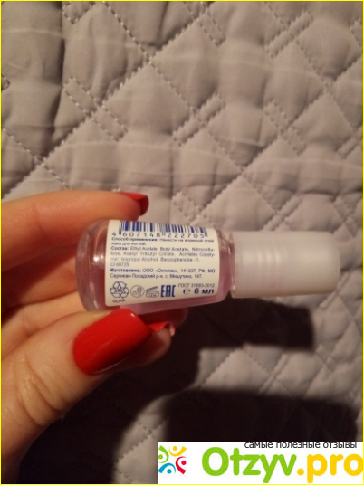 Производитель рекомендует наносить средство на влажный слой лака для ногтей, но в таком случае могут образоваться пузыри, а кисточка окрасится в тот оттенок, который на ногтях. При таком способе лак сохнет довольно долго (как бы нелепо это не звучало), а сколы начинают появляться чуть ли не через 2 - 3 дня.