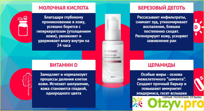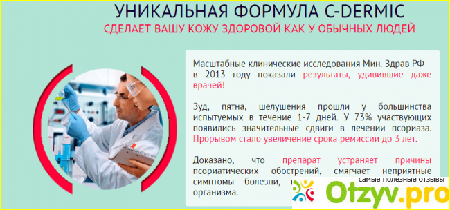 Если говорить в целом, то препарат позволит вам полностью избавиться от симптомов, как снаружи, так и внутри, полностью остановить воспалительные процессы, а также, позволяет укрепить иммунную систему человека. Если говорить о медицинской проверке, то можно не беспокоиться - C-Dermic рекомендуется 17 дерматологами мирового уровня.