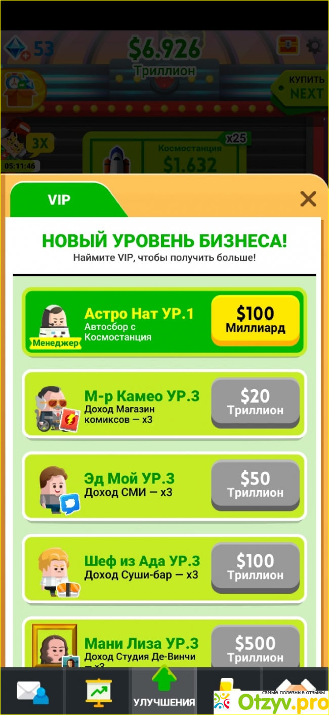 2) Улучшения – здесь можно приобретать разные плюшки для бизнеса. В основном своем это менеджеры, которые превращают бизнес в целом в пассивный режим. Когда вы можете прийти и просто распорядиться деньгами. Менеджеры также делают сбор денег еще быстрее, и увеличивают доход, поэтому не советую экономить на них, а купить как можно больше улучшений дабы бизнес процветал.