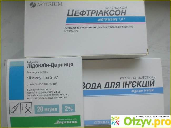 Также прописаны способ применения, дозы. Мне врач назначил один укол (сам цефтриаксон в порошкообразном виде) с водой для инъекции один раз в день. А продолжительность курса - 7 дней. Но в аптеке мне посоветовали купить и лидокаин, так как если только с водой, то укол будет болючим.