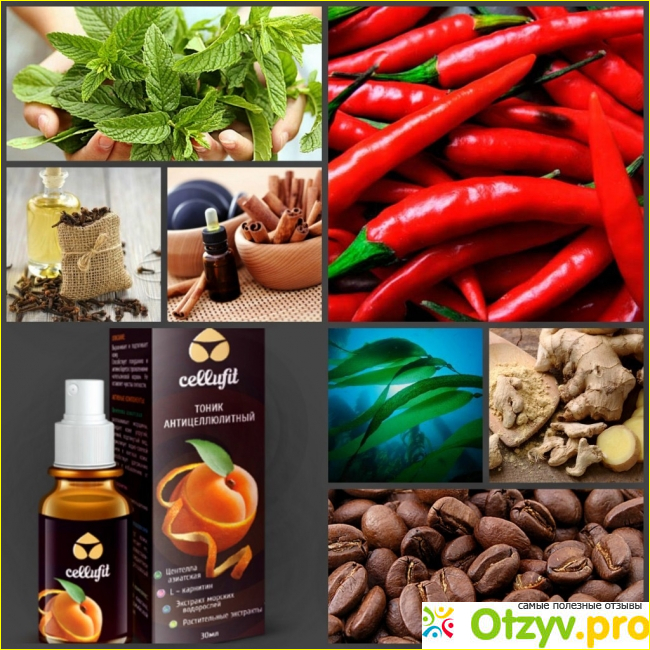 Одними из причин появления целлюлита принято считать неправильное питание и плохую экологию. Тем лучше на фоне этих проблем выглядит факт, что в составе спрея «Cellufit» отсутствует любая вредная посторонняя химия. Основными действующими компонентами являются натуральные природные вещества: центелла азиатская, L-карнитин, экстракт мяты перечной, экстракт красного перца, кофеин, эфирное масло гвоздики, имбирь, эфирное масло корицы, экстракт морских водорослей.