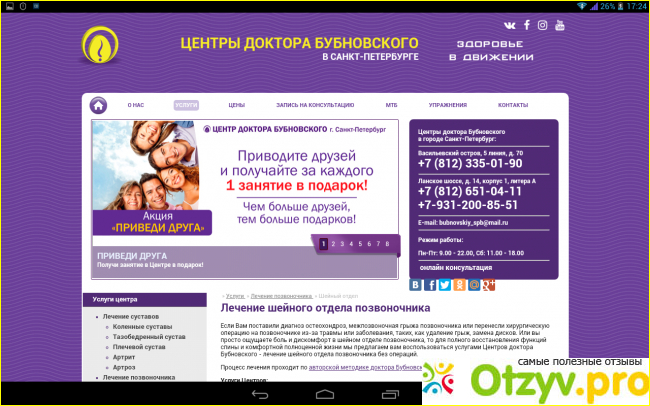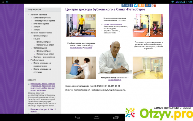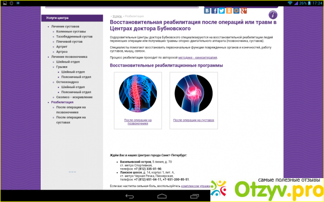 Я очень обрадовался когда узнал что санкт-петербурге появился центр для лечения проблем со спиной имени доктора Бубновского. я знал что в центре есть специальный аппарат который разработал Доктор Бубновский. Находился недалеко от Васильевского острова, Пятый проезд. Где находится два таких центра как я узнал на сайте, понял что на вооружении у данного центра находится вся разработанная доктором бубновским специальная техника и тренажёры которая может мне помочь для восстановления моей спины.