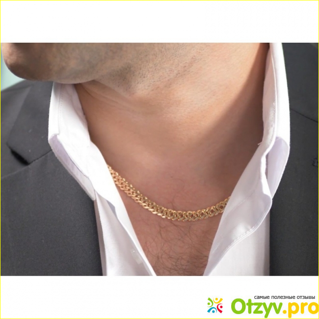 На фотографиях изображены как отдельно цепочка, так и это ювелирное украшение на шеи мужчины. Мы сразу же отметили, что цепь хорошо видна, она приковывает к себе взгляд и позволяет любой мужской образ сделать на порядок солиднее.