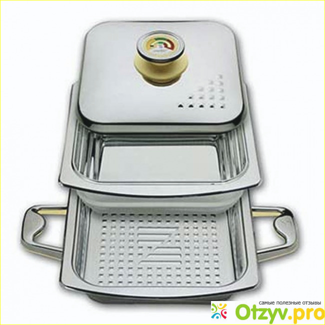 Посуду покупала с мужем в 2005 году стоила она тогда по моему около 1500 долларов, я бы ее и не купила, так муж уговорил, больно уж хорошо отзывались об этой посуде его знакомые. В набор посуды входило пару кастрюль,2 сковородки, сеточка для приготовления на пару, крышка скороварка и миска. Пойдя на поводу у мужа решилась таки купить эту удивительную, качественную посуду, тем более производитель обещал что я смогу в ней готовить без воды и масла.
