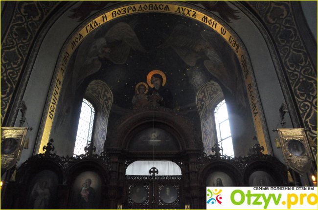 Церковно-славянским шрифтом, прямо над алтарём, написана молитва Похвала Пресвятой Богородице.