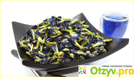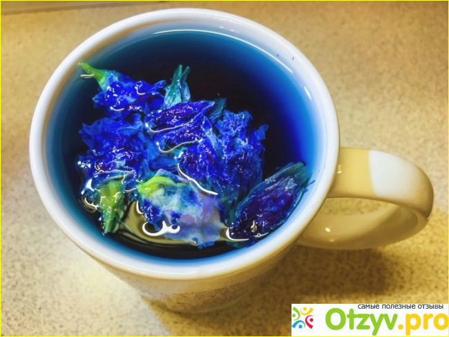 Главное правило при заваривании такого чая, заключается в правильности, если всё сделать как положено, то в таком случае он приобретает очень красивый насыщенный синий цвет. На вкус он в общем никакой, а если в него капнуть пару капель лимона, так цвет вообще можно изменить до пурпурного. Состав такого чая достаточно хороший и в него входят такие компоненты: тианин, дубильные вещества танины, кофеин, катехины, биофлавоноиды, L-карнитин, метилксантины, хром, дофамин, лютеин.