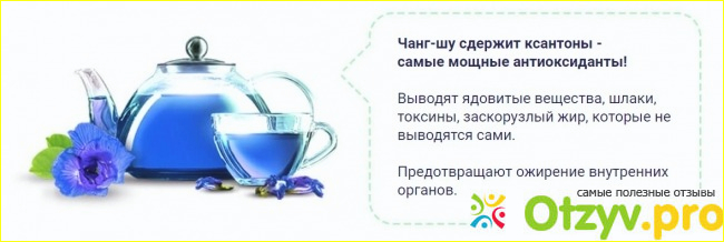 Чай чанг шу получают из цветков клитории тройчатой. Это растение произрастает на Тибетских горах и на территории Тайланда. Из цветов получают удивительный чай насыщенного, красивого синего оттенка. Этот чай очень полезен для женского здоровья, а также используется в процессе интенсивного похудения. А составе чая катехины, биофлавоноиды, катехины, витамины группы В. Чай содержит фитоэстрогены, родственные естественным эстрогенам женщины.