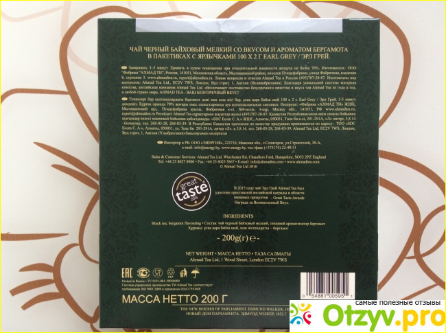 На коробке есть ряд информации, которая поможет ознакомиться потребителю с товаром: подробное описание напитка; количество пакетиков; вес; информация о производителе; правила хранения и сроки годности; инструкции от производителя, как лучше заваривать чай, чтобы он получился более ароматным и насыщенным.