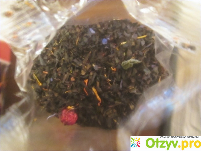 Заварка вблизи крупным планом, видно, что помимо мелковатого черного чая, туда еще что-то синее и оранжевое положили.