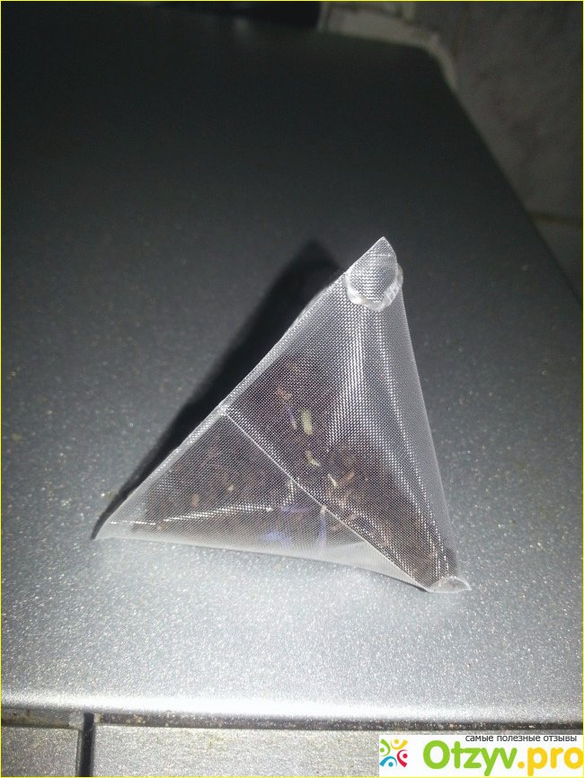 Пакетик, вернее, пирамидка из плотной синтетической сетки, такая не развалится и не порвется. На нитке висит ярлык, за который удобно вытягивать пирамидку из чашки.