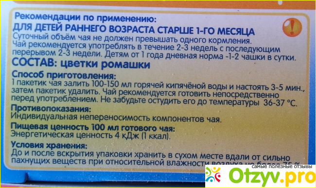 Я заварила чай по инструкции. Настаивать 3-5 минут, на первый раз можно 2 минуты. Давать ромашковый чай можно с 1 месяца. Остудить до температуры 37 градусов примерно. Но дочка чуть-чуть из бутылочки попила и больше брать не стала, горький вкус. Поэтому пью я, вкусный и питательный чай. Но я взрослый человек и понимаю, что хоть и горький вкус, но много полезных веществ в этом чае. Ромашковый чай успокаивает и расслабляет. Если и вы не любите травяные чаи, можно ребенка купать в травяном отваре. Настоять несколько пакетиков и вылить в детскую ванну, искупать малыша.