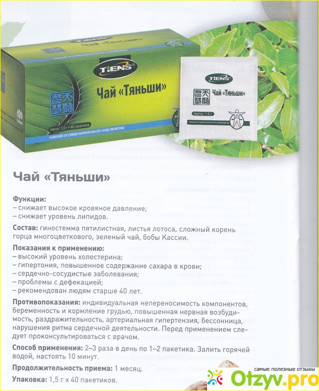 Чай от китайского производителя Тяньши является активной биологической добавкой. В этот напиток входит 6 сортов зелёного чая плюс натуральные растительные компоненты: геностемма пятилистная, листья лотоса, сухой корень горца, семена кассия, цедра мандарина, частуха подорожниковая. Все целебные травы произрастают в Тибете.