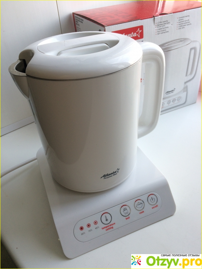 Чайник приятно выглядит и не занимает много места, управляется сенсорными кнопками на панели, которые подсвечиваются красным. При закипании воды в режиме чайника срабатывает автоматическое отключение.