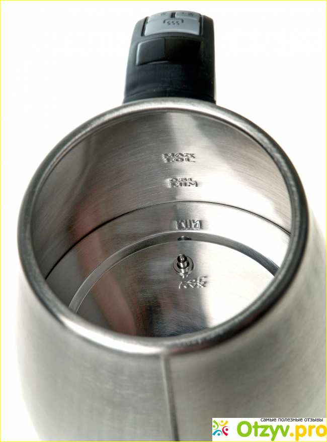 Колба прибора сделана из нержавейки, прочная, надежная, долговечная, внутри оснащен термодатчиком (на дне) и отметки емкости min/max, с помощью которых вы сможете ориентироваться и отмерять нужное количество воды. 0,5 литров – минимальное, 1 литр – максимальный объем.