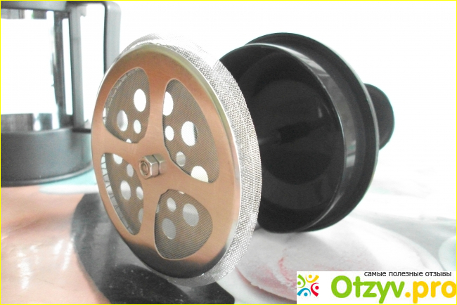 Стеклянный "стакан" с носиком, чтобы было удобнее наливать напиток по чашкам изготовлен из специального термостойкого стекла, до 120 градусов. В него можно безбоязненно наливать кипяток, он не треснет. Чтобы чайник удобнее было брать, "стакан" установлен в пластиковый "подстаканник" с удобной ручкой. Не обожжешься. В данном бюджетном варианте он самой простой формы и пластмассовый. Во френч- прессах подороже он металлический ажурный. Сверху "стакан" закрывается крышкой с отверстием, сквозь которую проходит подвижный стержень. В верхней части стержня имеется рукоятка, а в нижней ситечко - сеточка на каркасе для повышения жесткости конструкции.