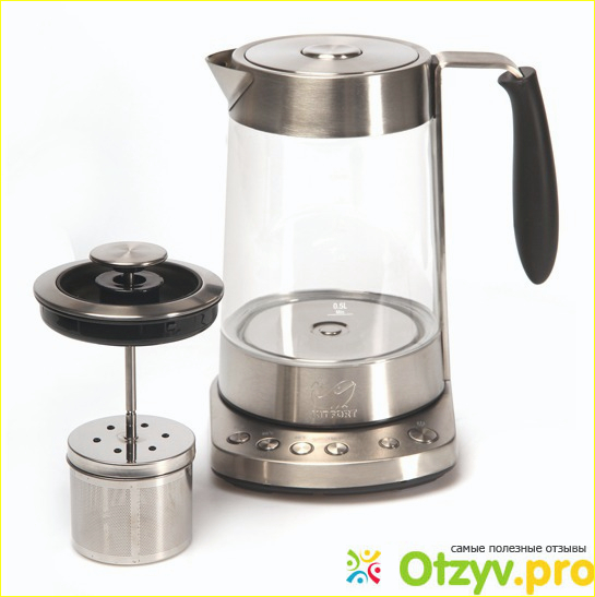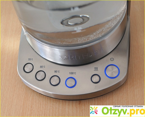 Наверное всем известен тот факт, что чай заваривает зависимо от температуры, один чай заваривается кипятком в 100 градусов, другой меньше, так и кофе. Некоторые сорта чая следует заваривать при определенной температуре, именно для этого на чайнике присутствует специальная панель управления. Она встроена в подставку к чайнику, на ней присутствует всего лишь 6 кнопок сенсорного типа. Основная – это включение нагрева воды и выключение. Затем идет целая интеллектуальная система подогрева – это кнопки подогрева воды до определенной температуры, что позволяет правильно заваривать любые сорта чая, или добиваться определенной необходимой температуры воды для приготовления различных блюд.