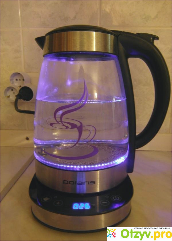 Эта модель чайника не обычная - с подсветкой голубоватого цвета. Выглядит очень красиво! Когда он стоит без дела - чайник и не виден особо на кухне, особенно благодаря своей прозрачности, он абсолютно не заметен. А когда включаем - глаз не отвести.