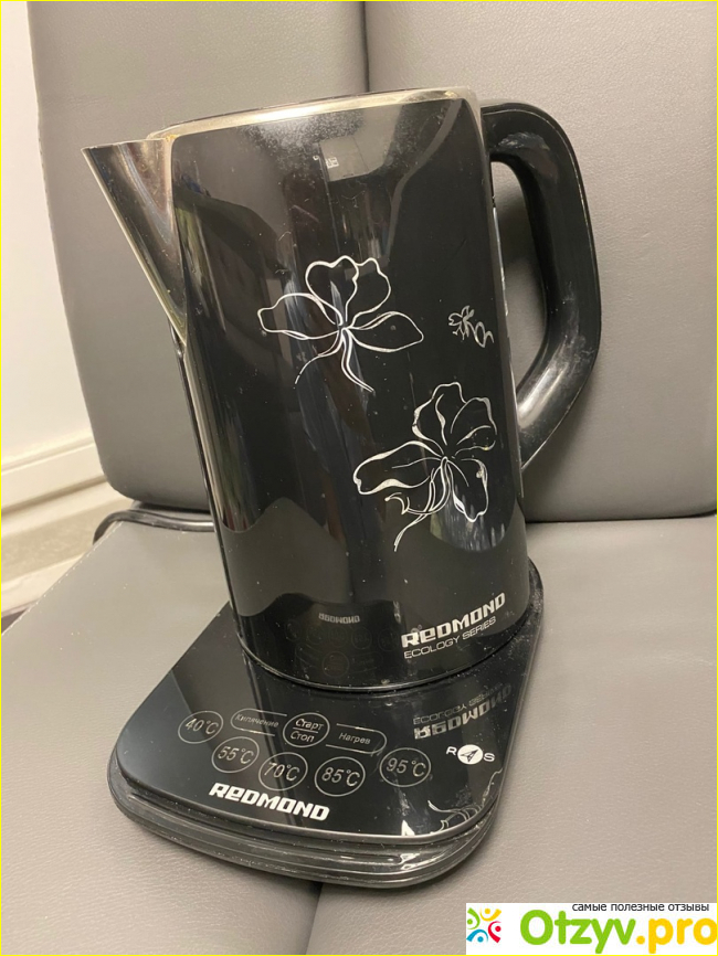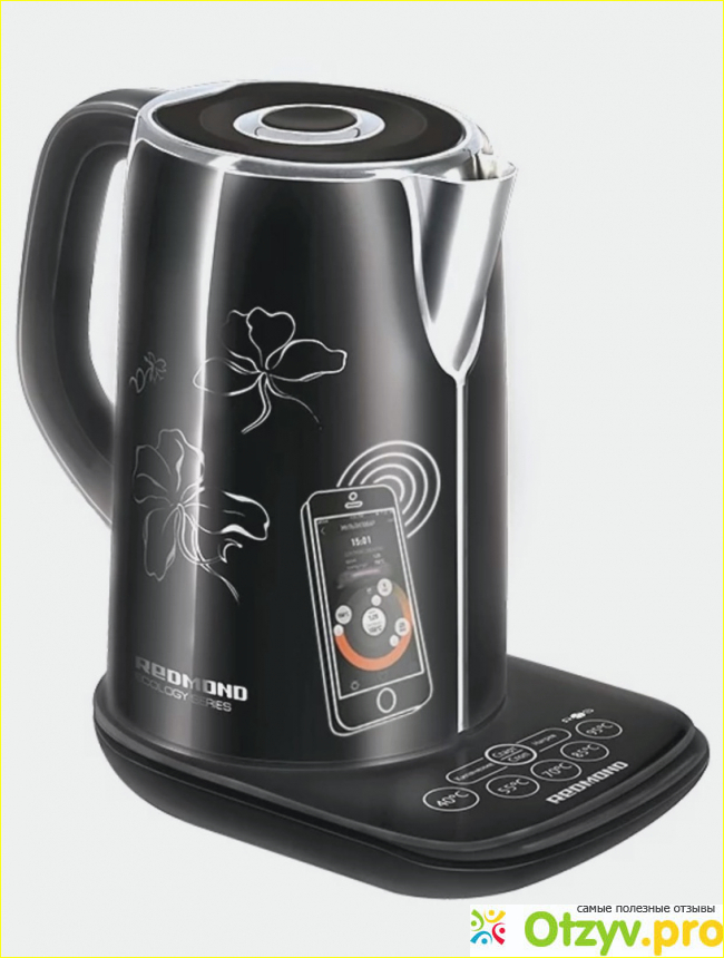 , что приобрела этот чайник в большей степени из-за красивого дизайна и возможности дистанционно включать его. Управлять чайником можно с помощью телефона, только сначала нужно скачать мобильное приложение. У данного электрочайника имеется 5 температурных режимов: 40, 50, 70, 85 и 95 градусов, а также кипячение воды и нагрев, плюс ко всему у него сенсорная панель управления.