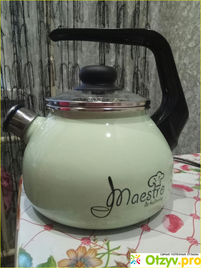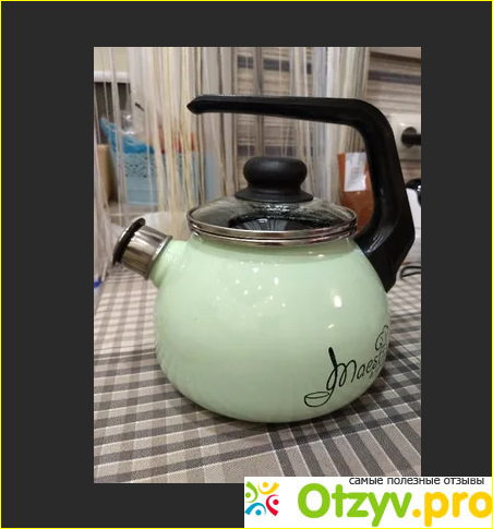 Скромно-зеленоватый чайник удачно вписывается в дизайн любой кузни вне зависимости от ее цветового оформления. У меня, к примеру, кухня выдержана в светлых бежевых цветах и такая посуда стала не акцентом, а маленькой нежной точкой и завершении ее интерьерного дизайна.