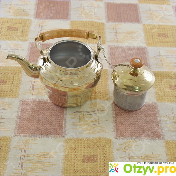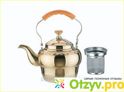 Объём такого чайника составляет один литр. Также в комплектации к такому чайничку прилагается сточка для заварки, с помощью которой очень удобно заваривать чай. Само покрытые у такого чайника золотистое.