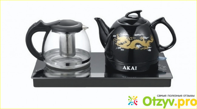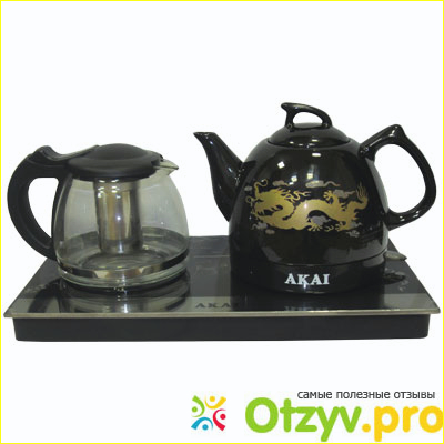 Они разных размеров и изготовлены из разных материалов. Их используем для каждодневного чаепития, а чай у нас в семье любят все. Для более торжественных случаев, когда приходят гости у нас есть не просто чайник, а чайный набор. Хочу рассказать о чайном наборе, который нам подарили в этом году. Это набор AKAI KA -110C. Вот так симпатично выглядит этот набор.