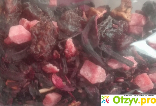 Итак, состав, в принципе, вполне соответствует названию "напиток чайный с ароматом клубники и малины": цветки гибискуса, плоды шиповника, кусочки яблок, папайя, ягоды вишни, кусочки ягод малины, изюм и ароматизаторы. Среди всего названного вполне различимы изюм, засушенные яблоки и скрутки листочков каркаде. Другие компоненты особо не выделяются – остается только верить обещаньям на упаковке.
