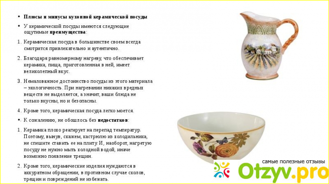 О плюсах и минусах керамической посуды, наверное, говорить не стоит. Каждый из нас и так знаком с керамикой и отлично знает что это такое.