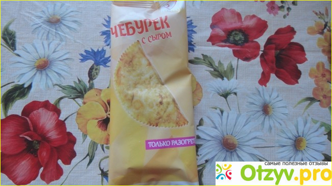 Состав продукта не читала, так как не вижу в этом смысла, а во-вторых — он напечатан слишком мелко. Но никаких подозрительных включений в изделии я не заметила, он довольно вкусный и вполне подходит для быстрого перекуса, прекрасно заменяя обычный бутерброд. Он не маленький, — 70 граммов, сыра изрядное количество. Стоит такой чебурек всего 23 рубля, приобретаю я их в магазине «Полушка», но встречаются они и в других.